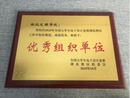 (教工通讯员:安忙忙)近日,2025全国大学生电子设计竞赛湖北赛区颁奖大会在武汉大学召开。鉴于我校在2025全国大学生电子设计竞赛湖北赛区工作中组织规范,成绩优秀,被授予“优秀组织单位”。