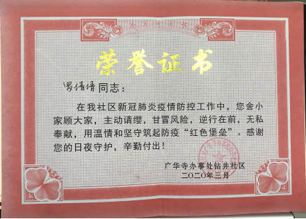 抗疫期间每天晚上,她都参加社区巡逻、门岗值守、劝导不戴口罩居民、驱散聚集人群、劝归遛狗住户。气温低她就多穿点,下雨下雪她就打着伞。由于所在小区老年人居多,当“健康码”开始推行后,她挨家上门为老年人注册健康码,不厌其烦回答社区居民的问题。自在社区报到以来一直坚守到返襄的前一天晚上。她的工作受到了社区工作人员的一致肯定。