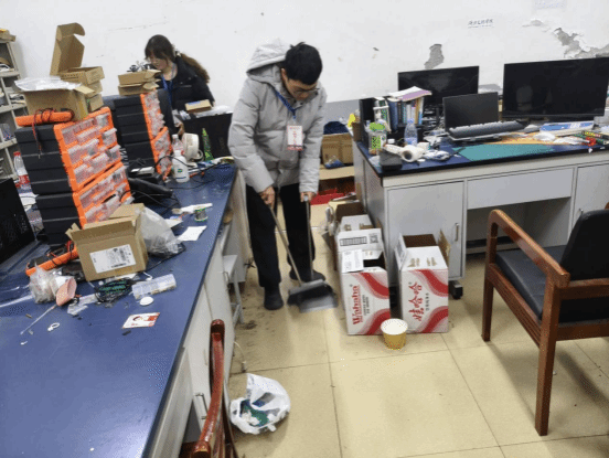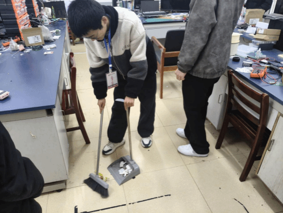 上午9点30分,志愿者们携带清洁工具有序开展工作,分工明确、协作高效,以严谨细致的态度落实每一项清洁任务。大家各司其职,有的专注擦拭实验台面,清除污渍后将零散器材、资料分类归置,让桌面整洁有序;有的负责地面清扫与拖拭,对缝隙、墙角等卫生死角重点清理,彻底清除积尘与杂物;有的轻拿轻放整理实验室设备,擦拭表面浮尘的同时检查摆放位置,确保设备规整安全;还有的将清洁产生的实验废料、生活垃圾严格分类打包,统一转运至校园指定处理点。整个过程中,志愿者们不惧琐碎、踏实肯干,充分展现了青年学子的责任担当与不怕苦、不怕累的劳动精神,让志愿红成为实验室里一抹亮眼的色彩。清扫工作结束后,实验室管理员与活动负责人共同对清洁成果进行全面验收,从桌面整洁度、地面清洁状况到设备摆放规范度、垃圾分类落实情况逐一检查,确认各实验室均达到整洁、安全、有序的预期标准,实验室环境焕然一新。